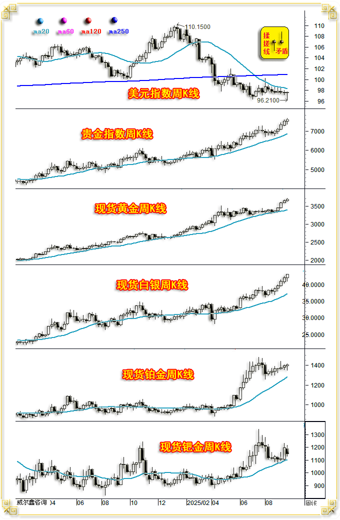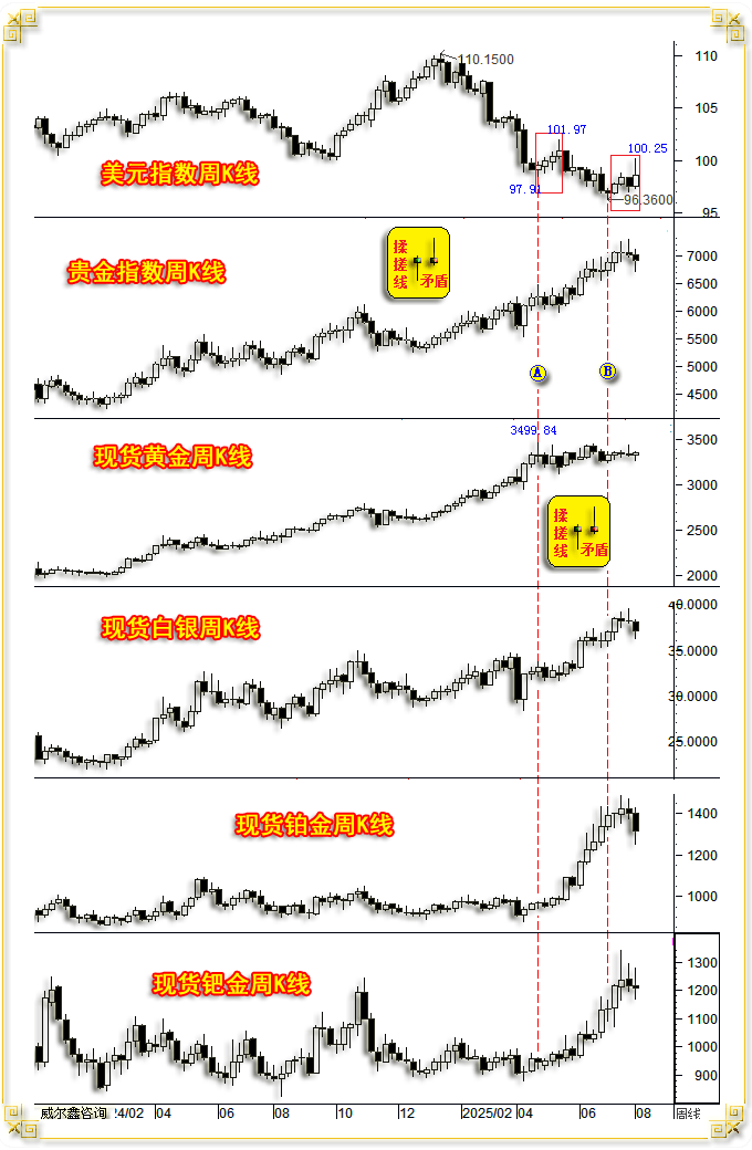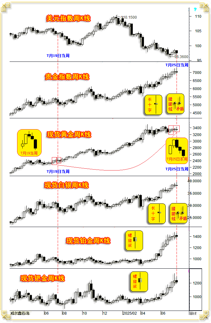 A当周,雷同客岁7月16日金价见顶2483.57美元当周。本周金价、贵金属、根基金属先扬后抑,即便如斯,不雅美元指数周K线,彰显市场纠结心态。周K线呈先扬后抑,再续中期跌势,这两个议息时点前,同样彰显市场矛盾纠结。不只K线形态类似,最初回到本期“焦点”内容解读!